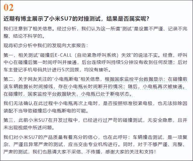小米汽车方面强调称,此前小米SU7在开发过程中,已经进行过严苛的碰撞测试,无安全隐患,且并未出现视频中所述问题。
