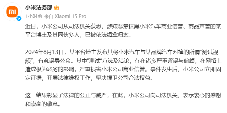 栏目分类小米汽车遭恶意抹黑,涉案博主及同伙已被缉拿归案!